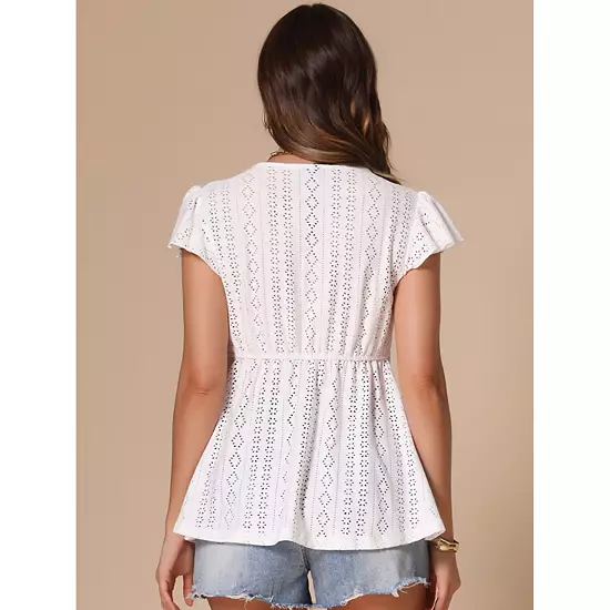 Ruffle Peplum, Crochet Eyelet, Cap Short Sleeve, Tie Neck, Solid Color, Regular Fit, The cute peplum design and cap short sleeves of our summer babydoll tops add a touch of femininity and charming to any outfit. Suitable for dating, beach holiday, shopping, park, streetwear and so on. Perfect to dress with skirt, shorts, pants and jeans in spring, summer beach.