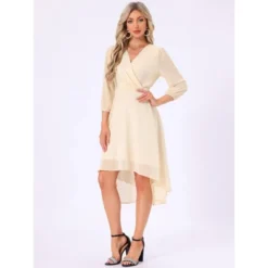 INSPIRE CHIC Women’s V Neck Sheer 3/4 Sleeve Wrap Cocktail Midi Dresses