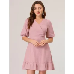 INSPIRE CHIC Women’s V-neck Puff Short Sleeve Ruffled Hem Mini Dresses