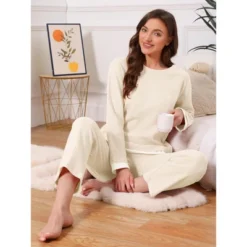 INSPIRE CHIC Women’s Cotton Pajamas Waffle Long Sleeves Top And Pants With Pockets Lounge Sets