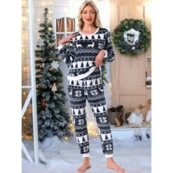 INSPIRE CHIC Women’s Pajamas Flannel Printed Long Sleeve Top And Pants Christmas Sets