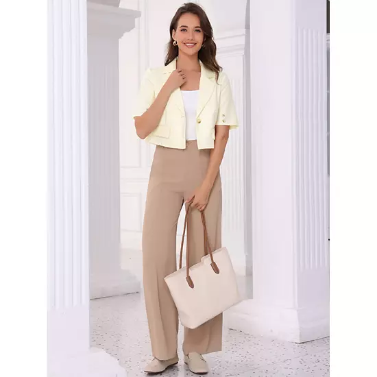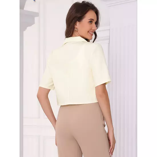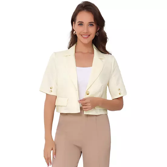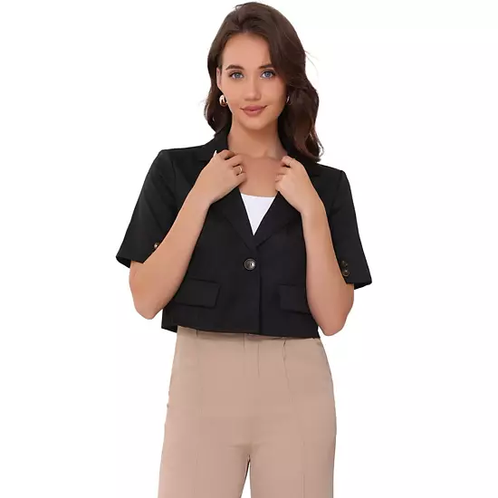 This basic blazer is made up of several design points: notched lapel collared, one button, open front, cropped, short sleeves; Suitable for work, business, office, dinner date, meeting and more semi formal occasions; The cropped length makes this womens blazer jacket a really stylish piece to layer over your favorite dresses or to wear with skirts, trousers, jeans, and shorts.