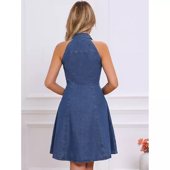 This dress is made up of several design points: sleeveless, halter neck, collared, button down, A-line, denim fabric, lightweight fabric, unlined; Suit for summer and versatile for many occasions, including casual, elegant, office, work, business, meeting, cocktail party, and date; Pair with stylish high heels for creating a confident and sophisticated appearance.