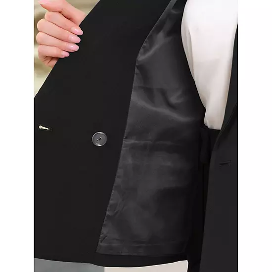 This notched lapel blazer features a lapel neck; It has a double breasted design and long sleeves; Padded shoulders add structure; Flap pockets provide functionality; Full lined for comfort; Suitable for autumn and winter occasions such as office, work, meetings, and formal events; Perfect to pair with wide leg pants or a pencil skirt for a business-casual look.