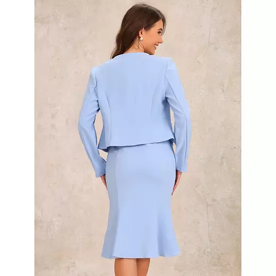 This dress suit sets is made up with several design details: Blazer: cropped length, open front, collarless, fake pockets; Dress: round neck, midi length, fishtail hem; Suit for spring fall winter, casual, work, office, business, formal, dating, coffee shop, etc; A trendy item, easily to matched with high heels and pretty bags, suit for all year around.