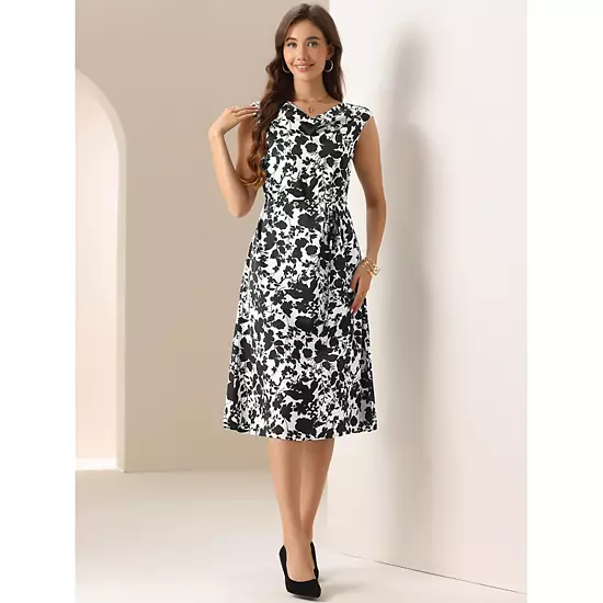 This sliky dress is made up of several design points: Satin Fabric, Cowl Neck, Cap Sleeve, Midi Length, Tie Waist; Occasion: casual office, dinner date, social gathering, evening party, coffee shop, street, etc; This dress can be paired with heels or flats for a versatile outfit that transitions seamlessly from the office to dinner.