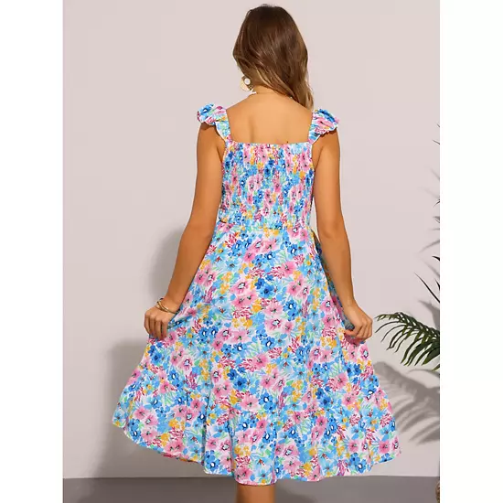 This Tiered dress is made up of several design points: Ruffle Neck, Smocked, Sleeveless, Ditsy Floral, Midi Length, Ruffle Layered Hem, Flowy a-line Dress; Suit for Summer and for many occasions, such as casual, dating, shopping, travel, vacation, daily wear, weekend gathering , etc; Perfectly pair with the high heels for a vacation look.