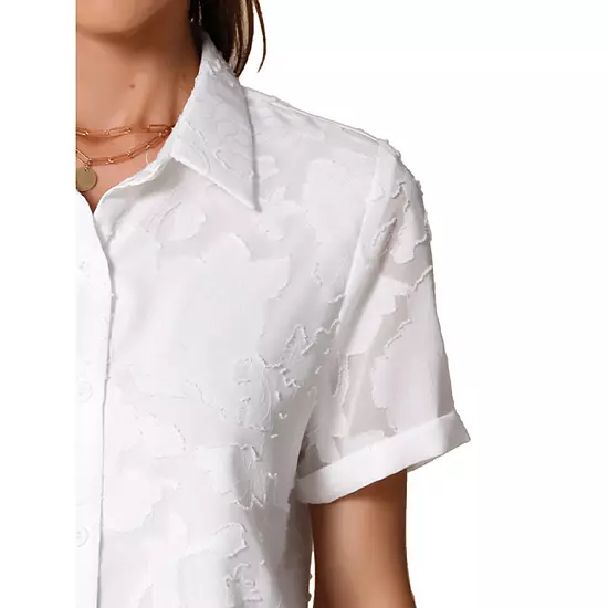 This solid color blouse features a jacquard floral pattern, short sleeves, and a lapel collar; The button-down design adds elegance and is perfect for various occasions; Lightweight and soft fabric, this top with a frilled front design, brings you a summer feeling; Graceful and elegant, this frilled top with solid color features a lapel collar and chiffon floral style; This button-down dressy shirt suits for Office, Shopping, Dating, Weekend Gathering, Beach, Outdoors, Casual, etc.