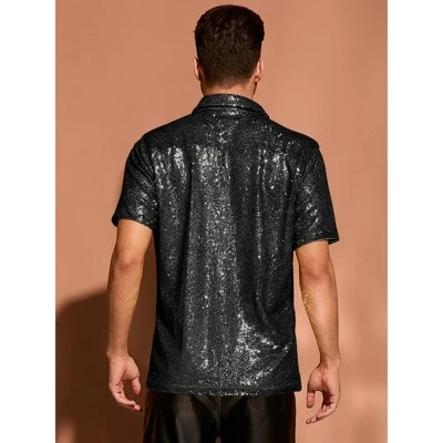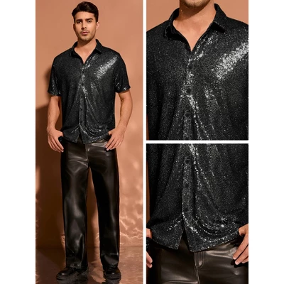 This shirt features a dazzling sequin design that reflects light beautifully, making it ideal for a 70s disco theme or any festive occasion. The short sleeves and regular fit ensure comfort and ease of movement, while the point collar adds a touch of classic style. Pair it with metallic pants or faux leather shorts for a complete party look. This glittering button-down shirt suits Halloween parties, nightclubs, school celebrations, disco proms, and more. Please note that it is recommended to hand wash only and avoid machine washing or ironing to maintain its sparkle and quality.