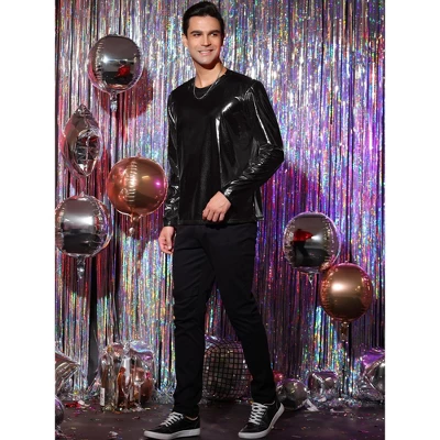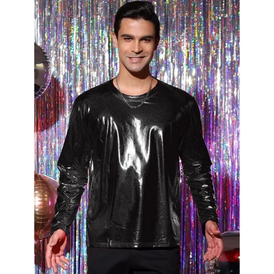 Featuring a metallic texture, this long-sleeve T-shirt makes you eye-catching in the crowd. Made of stretch fabric, it ensures more flexibility when you are moving. Hand Wash Only. You can pair the shining T-shirt with a jacket, jeans, or punk pants for a stylish look. Brilliant bright under the light. Suitable for parties, clubs, discos, festivals, carnivals, nights out, proms, and daily casual wear. Sparkle T-shirts enhance your charm and give you a street-trend look.