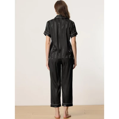 Satin Button-Up Short-Sleeve Long-Pants Pajama Set. Matching couples are crafted from soft, durable fabric. It has excellent elasticity for a perfect fit, which is breathable, comfortable, and soft to wear. Striped pattern in short sleeve shirt and pants, elastic waist, button down, comfortable and soft for daily nightwear. No matter the cozy bedtime, casual home relaxation, laze afternoon, or comfy bath, the soft and lightweight women’s sleepwear can always accompany you. This soft pajama lounge set is perfect for slumber parties, pajama nights, or daily wear, or as a holiday gift for Mother’s Day, Holiday, or Birthday. Great for loungewear, nightwear, sleepwear, home bedroom, and daily wear. The pants have an elastic waist, making them convenient to take on/off. Suitable for home, leisure, or outdoor walks.