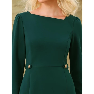 Featuring an asymmetrical neck, long sleeves, a sheath dress, and knee-length. Pair with an elegant necklace and high heels for a chic business office look. Comfortable and classic, this professional pencil dress is perfect on its own or as a layer under a blazer or jacket. This dressy, elegant dress can be a perfect addition to almost any outfit from formal to daily casual wear, great for church, work, meeting, office, businesses, party, cocktail, wedding guest, casual, daily dressing, graduation, homecoming, etc.