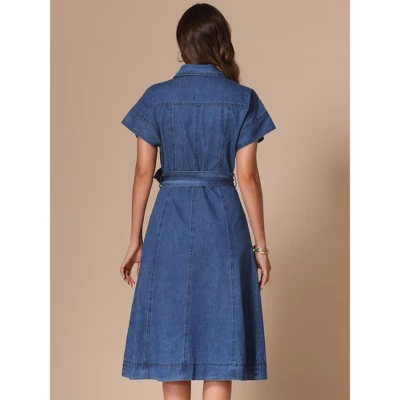 The denim dress is crafted from a blend of 85% cotton and 15% polyester, offering comfort and style. This midi dress features a button-down front and a turn-down collar, allowing for adjustable neckline shaping. It includes short sleeves and two pockets, providing both function and fashion. The dress comes with a detachable belt in the same color, enabling you to adjust the waist width as desired. Perfect for a variety of occasions, this A-line dress pairs beautifully with high heels and a clutch for a chic look. Whether you’re attending a casual outing, work event, or vacation, this denim dress is a versatile choice.