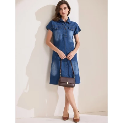 - Washed Denim Dresses, Point Collar, Short Sleeves, Side Pockets, Unlined, Above the Knee