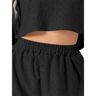 - This Lounge set features Hollow Out and Solid Color, Tops with Round Necks and long sleeves, Shorts with Slit Side and Elastic Waist design