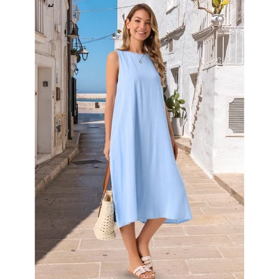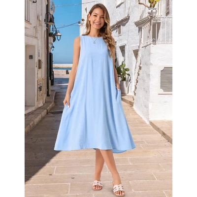 - Features: Sleeveless Summer, Midi Length, Tank Dress, Two Pockets. Crew Neck