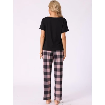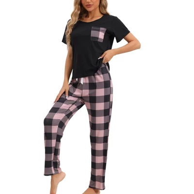 - Lounge sets feature soft fabric with a classic Plaid print design, short sleeve t-shirt, and bow decoration with elastic waist