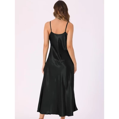 - Satin slip dress featuring V neck, sleeveless, spaghetti straps, maxi length