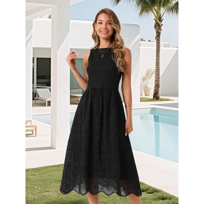This sleeveless dress offers a classic design that flatters any body shape, making it a timeless addition to any wardrobe. The A-line style and eyelet hem add a stylish and unique touch, while the lightweight and breathable fabric ensures comfort. Ideal for casual outings or more formal occasions, this dress is a versatile piece for any fashionista. Its effortless style makes it an essential piece for anyone looking to enhance their wardrobe with a chic and comfortable option.
