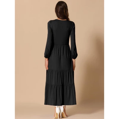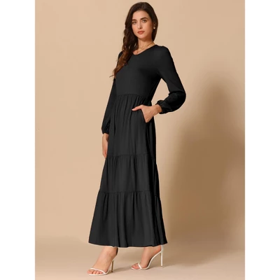 - Design points: long sleeve, crewneck, high waist, tiered hem, solid color, two side pockets, below knee