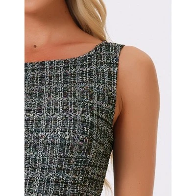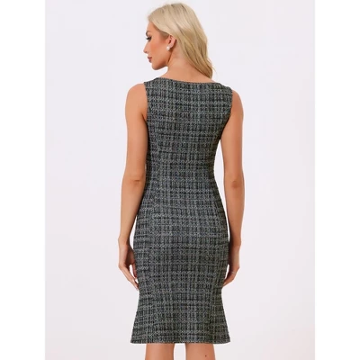 - Midi Dress. Tweed, Plaid, Slim Fit, Sleeveless, Zipper Side, Mermaid Hem