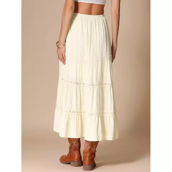 The Lace Trim Tiered Maxi Skirt is a must-have for women looking to provide a boho-chic style this summer; Its elastic high waist ensures a comfortable and flattering fit, making it perfect for a variety of body types; With its delicate lace patchwork and flowing tiers, this skirt adds a touch of whimsy and femininity to any outfit; Pair it with a simple tank top or a cropped blouse for an effortlessly stylish look ideal for warm-weather outings.