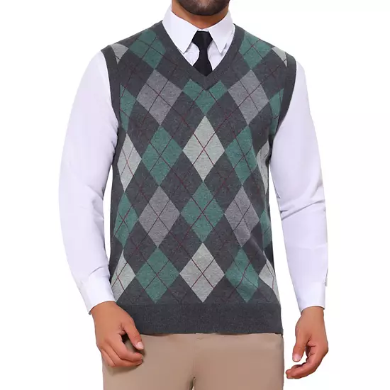 This sleeveless v-neck sweater vest features a classic plaid argyle pattern, perfect for both casual and formal occasions. Pair it with a dress shirt for a formal appearance or wear it over a polo or t-shirt for a more casual vibe. Crafted from soft knit material for all-day comfort and durability. Regular fit provides comfort and ease of movement, making it suitable for various occasions, from office wear to dinner, parties, or everyday outings.