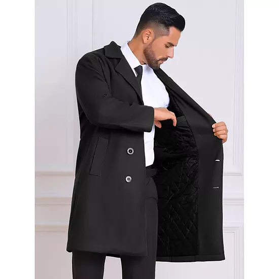 Crafted with a notch lapel and double-breasted front, this quilted overcoat combines timeless elegance with insulated warmth through its refined solid-color design. Equipped with two side pockets, this winter overcoat keeps small items secure while maintaining its sleek silhouette for professional or casual occasions. The interior padding provides lightweight yet effective warmth, making it ideal for business commutes or leisure outings in chilly weather. Pair this long trench coat with dress pants for a polished office look, or layer it over a sweater and jeans for sophisticated weekend wear.