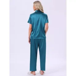 Women’s Satin Pajamas Silky Button Down Short Sleeve Lapel Shirt And Pants 2 Pcs Loungewear PJs Sets