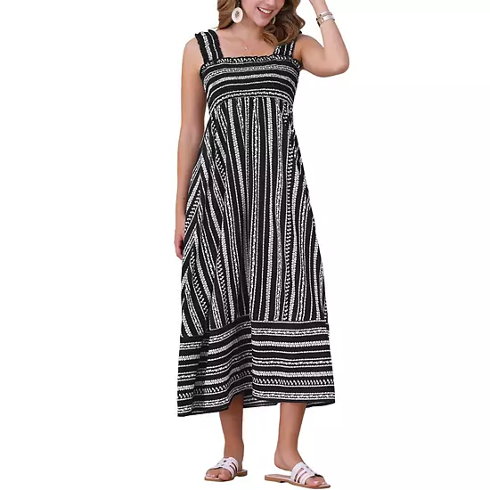 Square Neck, Geometric Printed, Sleeveless, High Waist, A-line Dress, Smocked Long Dress for Women; The empire-waist maxi dress with a-line hem can easily slender your shape and optimize your body proportion to show your soft femininity well, the smocked bodice will offer you some extra comfort and stretch; Women casual beach sundresses, suitable for women of all shapes, pair beautifully with sandals, heels, straw hat for a holiday look, or match with a cardigan and sneakers for a casual daily look; Elegant summer maxi tank dress, perfect for holiday, travels, beach, party, dates, shopping, outgoing, lounge, garden, home.