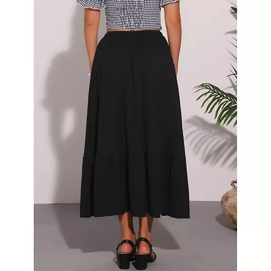 This elastic high waist midi skirt is made up of several design points: elastic waist, high waist, solid color, flowy midi skirt, beach holiday skirt; Suit for spring/summer and for many occasions, such as beach, holiday, school, homecoming, wedding, party, club, date night, weekend, travel, daily casual, etc; Pair the high waist skirt with tucked-in blouse and sandals for a casual look.