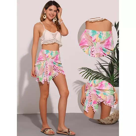 This skirt is made up of several design points: asymmetrical tassel hem, elastic waist, tropical floral print, tie side knot, mini length; Suit for summer and for many occasions: dating, beach, party, vacation, holiday, street wear, going out or daily wear;; It is perfect to be worn with a camisole, tank top, basic tee, T-shirt for a Hawaiian tropical style.