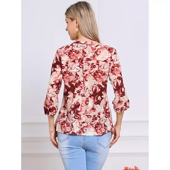 Floral prints create a vibrant look; V neck design adds a touch of elegance; Puffy sleeves provide a stylish silhouette; The 3/4 sleeve length is perfect for transitional weather; Half placket design offers ease of wear; Pleated trim enhances the overall aesthetic; Suitable for various occasions such as casual outings, parties, and vacations; Pairs well with basic jeans or maxi dresses for a trendy appearance.