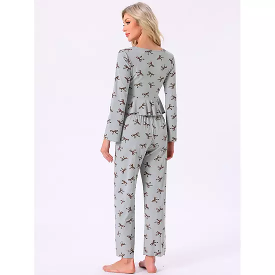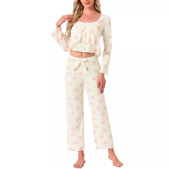 This 3-piece woman’s bow print pajama set consists of a long-sleeved and button-down cardigan, a built-in bra cami tank top, and bow-decorated elastic waist long pants. Made with soft and breathable fabric for comfortable wear, the fabric is very stretchy. You can wear it as a set or individually to match different clothes. Perfect for lounging out at home, sleeping, or traveling, etc.
