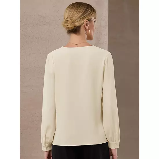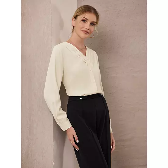 Keep your look professional and stylish in this elegant top, featuring a V neck, long sleeve, pleated front and button down; Pair with pencil skirts or suit pants for an elegant office look; Comfortable and versatile, this top is perfect on its own or as a layer under a blazer; Focused on Ladies’ Semi-Formal Wear, this shirt can be a perfect addition to almost any outfit from formal to daily wear, great for work, meeting, office, casual, daily dressing.