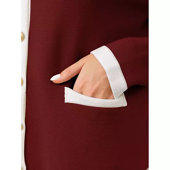Keep your look casual in this cardigan, featuring knit fabric, contrast color trim, long sleeve, collarless, button down, with pocket; Pair with tailored skirts or wide leg pants for a casual office look; This cardigan can be a perfect addition to almost any outfit from formal to daily wear, great for work, meeting, office, casual, daily dressing, etc.