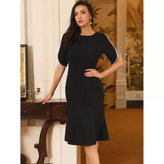 To be the shiny star in the crowd with women’s fishtail midi dress, beaded sleeves and round neck to show your charming; This fishtail midi dress is a stunning choice for semi-formal, formal or casual occasion like work, office, cocktail, evening, wedding guest, bridesmaid, banquet, prom, casual, daily, dog walk, shopping, etc; Pair this womens fishtail dress with exquisite high heels, necklaces, earrings and clutch for a gorgeous and glamorous look.