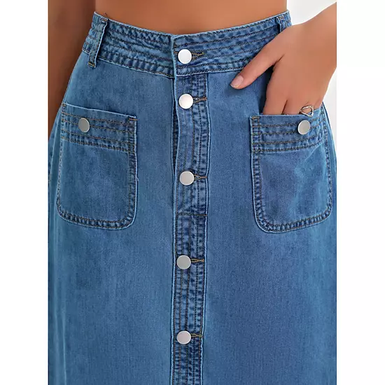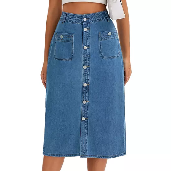 Features: Button Down, Front Slit, Pockets, High Waisted, A-Line, Midi Jean Skirt, Pencil Skirt, Long Skirt, Regular Fit, Multiple Colors to Choose; This Denim Skirt is designed to elevate your style with its vintage look and regular fit; It features a classic button-down front, midi length and pockets, making it a versatile and timeless addition to your wardrobe; Pair this denim skirt with tops, tank tops or denim jacket to create a fashion yet practical outfit.