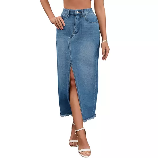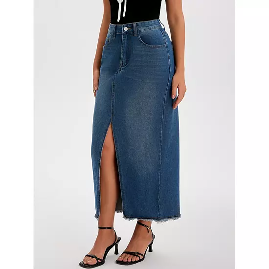 Long Denim Skirt Features: high waist, slit front, pockets, raw trim hem, washed denim, maxi skirt, long skirts, pencil skirt, soft, denim maxi skirts for women; This jean skirt is designed to elevate your style with its vintage look and regular fit; It features split front and washed denim, making it a versatile and timeless addition to your wardrobe; Pair this denim skirt with tank tops, tops or crop denim jackets to create a fashion yet practical outfit.