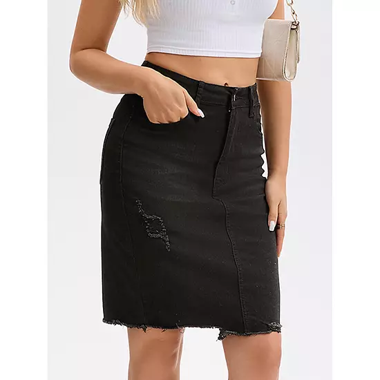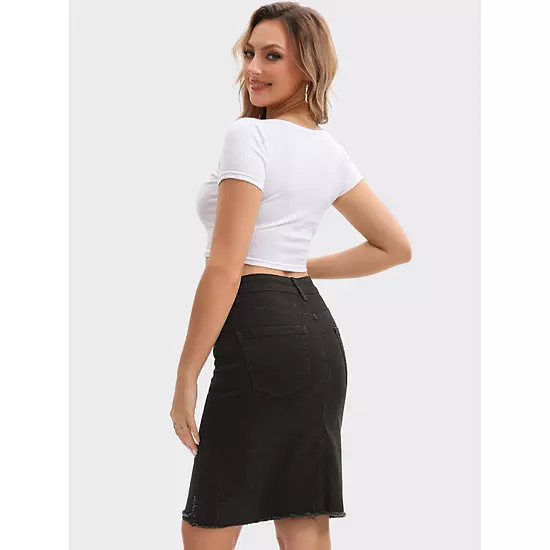 Features: Ripped, Raw Hem, High Waisted, Back Slits, Four Pockets, Bodycon, Regular Fit, Multiple Colors to Choose; This Denim Skirt is designed to elevate your style with its vintage look and regular Fit; It features a classic button-down front, above the knee and four pockets, making it a versatile and timeless addition to your wardrobe; Pair this denim skirt with denim jacket or tank to create a fashion yet practical outfit.
