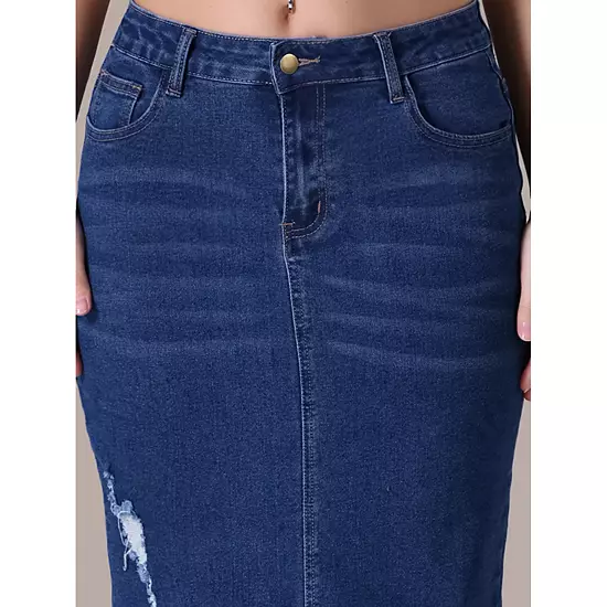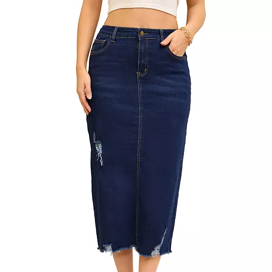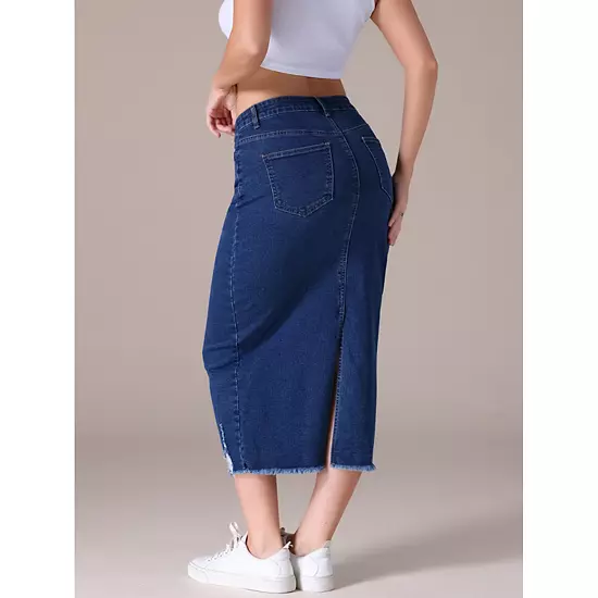 Classic and Fashion Style: This denim skirt focuses on casual style, finished with a ripped and raw hem detail for a touch of edginess and modern twist to the classic design; Features: Regular Fit, Button Front, Ripped, Raw Hem, High Waisted, Back Slits, Four Pockets, midi, casual jean Skirt for women; Casual Chic: Style with a basic tee and sneakers or high heel for a chic and urban-inspired outfit; Occasion: This jean skirt is suit for casual outings; Such as home, street, trip, outdoor, date, shopping, travel and so on.