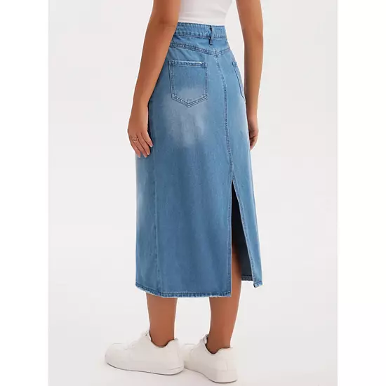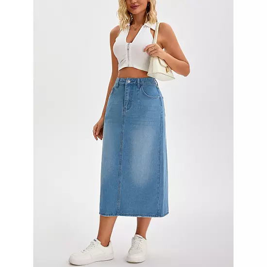 This denim skirt focuses on casual style, finished with vintage washed detail for a touch of edginess and modern twist to the classic design; Jean skirt features high waist, back slits, pockets, midi length, washed denim, vintage, retro color, pencil skirt, soft; Jean skirts for women denim style with a basic tee and sneakers or high heel for a chic and urban-inspired outfit; This midi denim skirt is suitable for spring/summer/fall and casual outings, such as home, street, trip, outdoor, date, shopping, travel and so on.