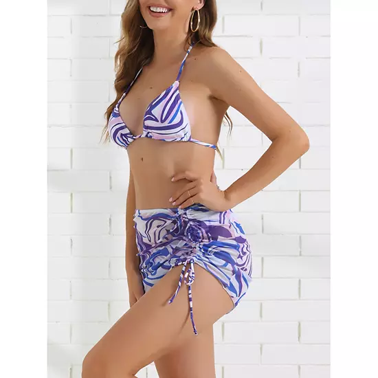 3 pieces, contrast color, self-tie, lace-up halter bikini triangle top, double straps at the back, tie closure at neck and back, removable padded cups, underwire, high cut triangle bottom, semi-opaque cover-up skirt, stretchy fabric, quick dry; Occasions: Suitable for summer swimming, tropical vacation, beach party, swimming pool, bathing, resorts, honeymoon, cruise, etc.