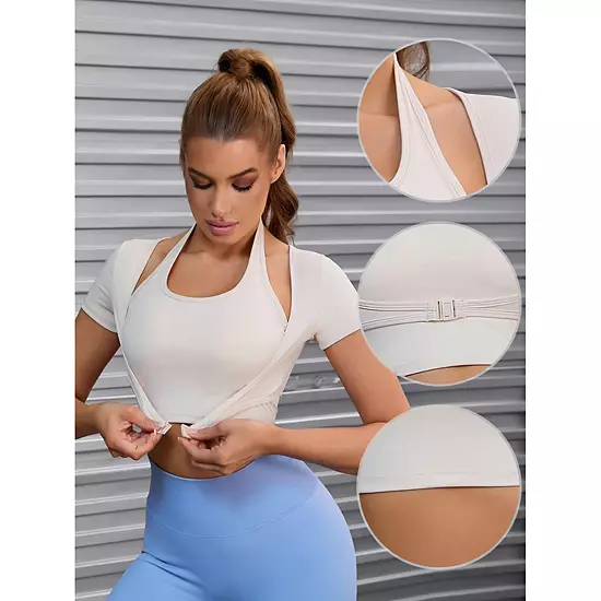 Halter Neck, Short Sleeve, Crop Top, Slim Fit; Crop top length of this top enhances the proportion of the body.; It is suitable for daily wear, fitness exercise etc; This trendy top features a convenient front closure and a slim fit design, perfect for your fitness routines; The halter neck style adds a touch of sophistication to your activewear collection, while the short sleeves offer breath ability during workouts.