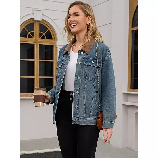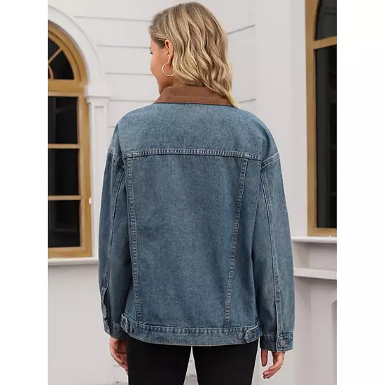 Women’s Denim Jacket with Corduroy Collar; Features: Long Sleeve, Button Down, Corduroy Collar, Two Real Pockets, Two Decorative Pockets, Denim Washed, Trucker Jackets for Women; This Denim Jacket is designed to elevate your style with its vintage look; Pair this jacket with jeans, Basic T-shirt or cami dress to create a fashion yet practical outfit.