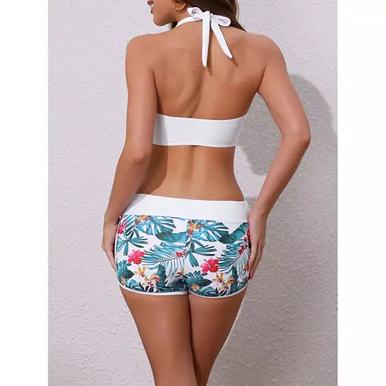 These bikini sets feature 2 pieces, solid color match with leaf print, self-tie, V neck lace up halter bikini triangle top, removable padded cups, no steel ring, high waisted tummy control boyshorts, stretchy fabric, quick dry; Suitable for summer swimming, tropical vacation, beach party, swimming pool, bathing, resorts, honeymoon, cruise, etc.