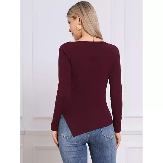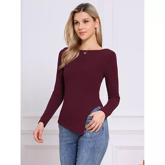 Long Sleeve Knit Top for Women’s Boat Neck Fall Winter Irregular Hem Long Sleeve Casual Pullover Shirt; Boat Neck design adds elegance; Long Sleeve provides warmth; Made with soft Knit Fabric for comfort; Irregular Hem offers a trendy look; Regular Fit ensures a comfortable wear; This leisure shirt matches well with most pants; Perfect to pair with high heels for a stylish jeans look.