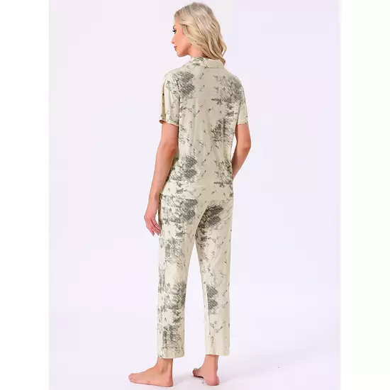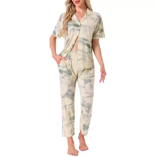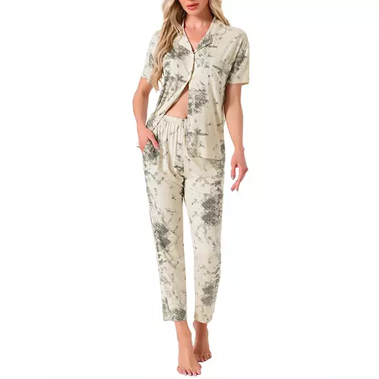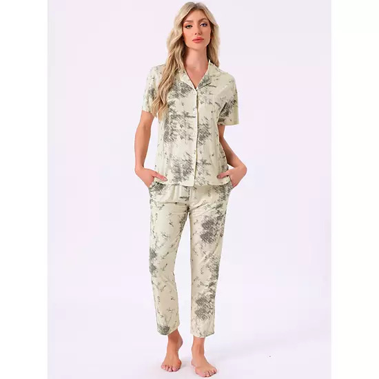 This pajama set offers a soft, smooth feel with added stretch. The fabric is lightweight and breathable, making it ideal for home relaxation in warm or transitional seasons. Features a button up top with short sleeves, notched collar, and drop shoulder detail for a relaxed silhouette. Paired with elastic waistband pants and functional side pockets, combining structure with comfort. Suitable for home lounging, bedtime, weekend mornings, or relaxed afternoons. The breathable tencel blend fabric and easy silhouette make it a comfortable choice for everyday wear.