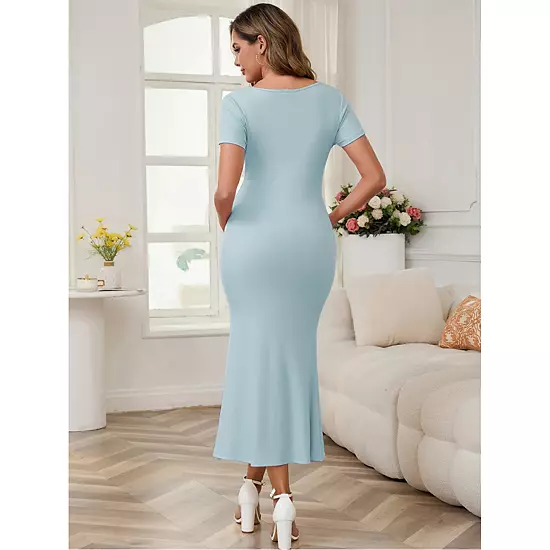 High stretchy ribbed knit fabric, the rib knit fabric is 4-way stretchy and breathable, ensuring comfort and a perfect fit as the belly grows throughout pregnancy. This maternity mermaid dress designed with fishtail hem, square neck, long ankle length. Stylish fishtail add elegant feel to your pregnancy look during pregnant and postpartum, offer a fashion, comfort look. The right amount of stretch and softness to keep you comfortable while maintaining the shape, making them ideal for your pregnant journey. Figure-enhancing design contours to your body without being too tight, This dress beautifully accentuates your curves and provides feminine silhouette. This pregnancy dress effortlessly transitions from an elegant evening ensemble paired with high heels and delicate earrings to a chic casual look when styled with flats and a relaxed hat for everyday wear, showcasing unparalleled versatility.