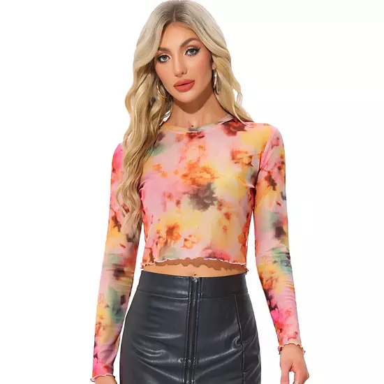 This women’s mesh crop top features a crew neck, long sleeves, and a trendy tie-dye design; The see-through mesh material adds a touch of charm to this fashion-forward blouse; Perfect for adding a hint of edgy style to your outfits, whether worn alone or layered over a camisole or bralette; Elevate your wardrobe with this sheer and stylish piece.